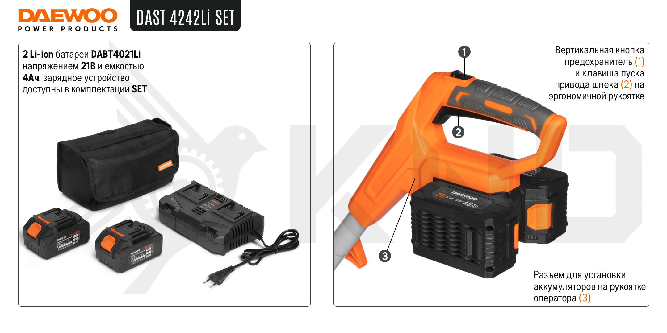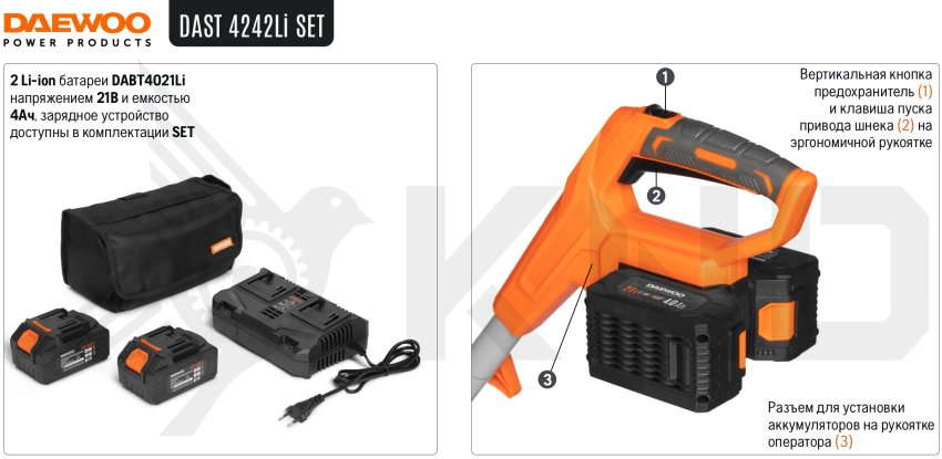 Модель совместима со всеми аккумуляторными инструментами и батареями DAEWOO линейки 21В.